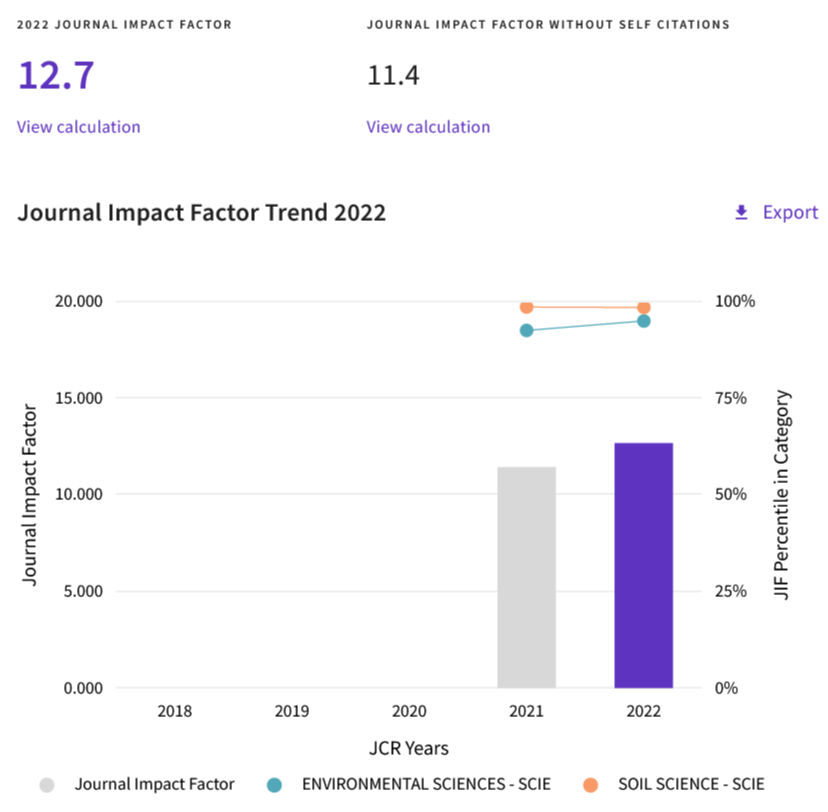 6月28日,全球专业信息与分析服务机构科睿唯安发布了2022年《期刊引证报告》,我校主办的期刊BIOCHAR最新影响因子为12.7,在土壤科学类37本期刊中排名第1位,在环境科学类274本期刊中排名第14位,全部位于Q1区。